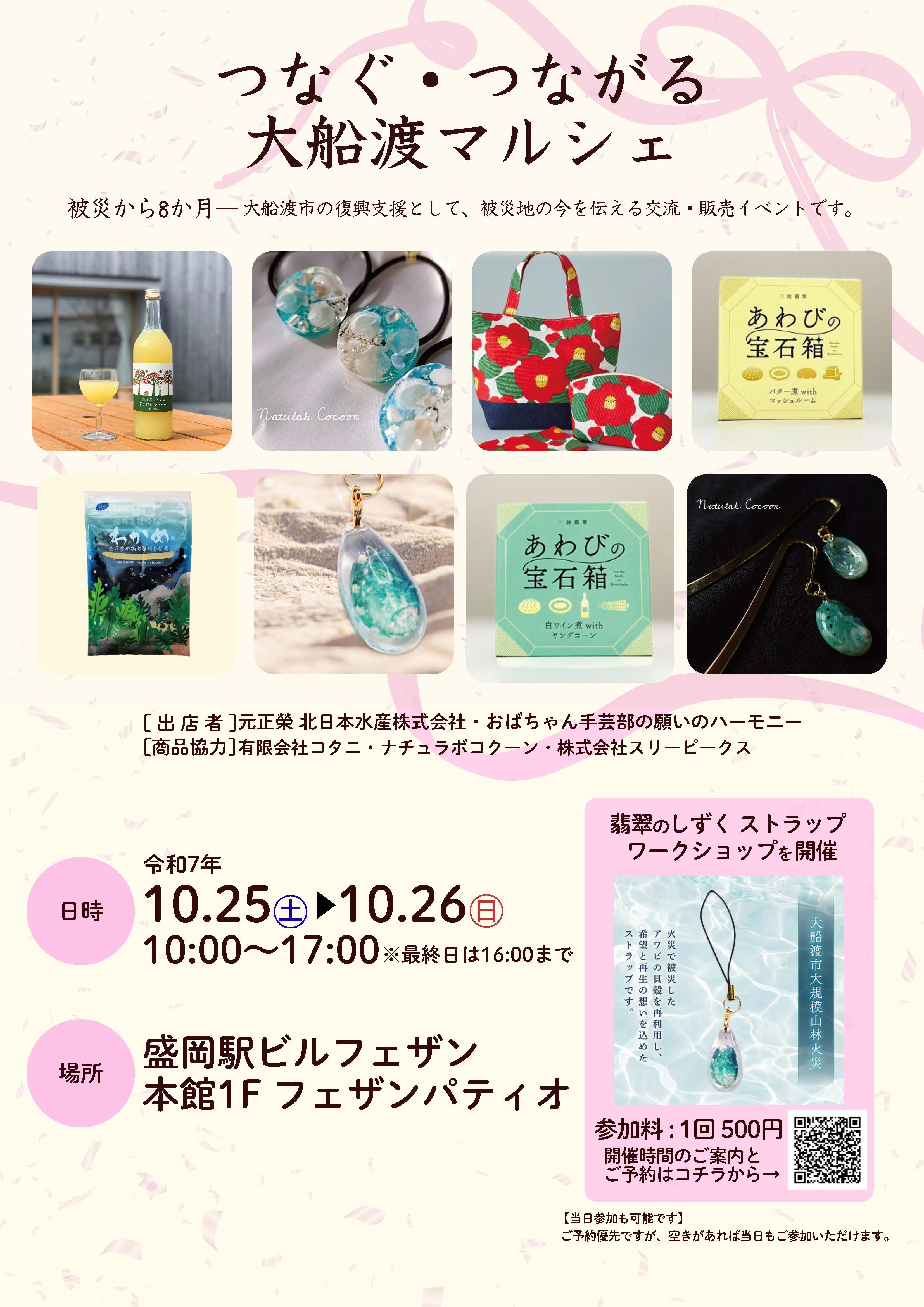 会場では、大船渡の魅力が詰まった特産品や手作り雑貨の販売、そして被災地の自然素材を使った体験型ワークショップをお楽しみいただけます。
