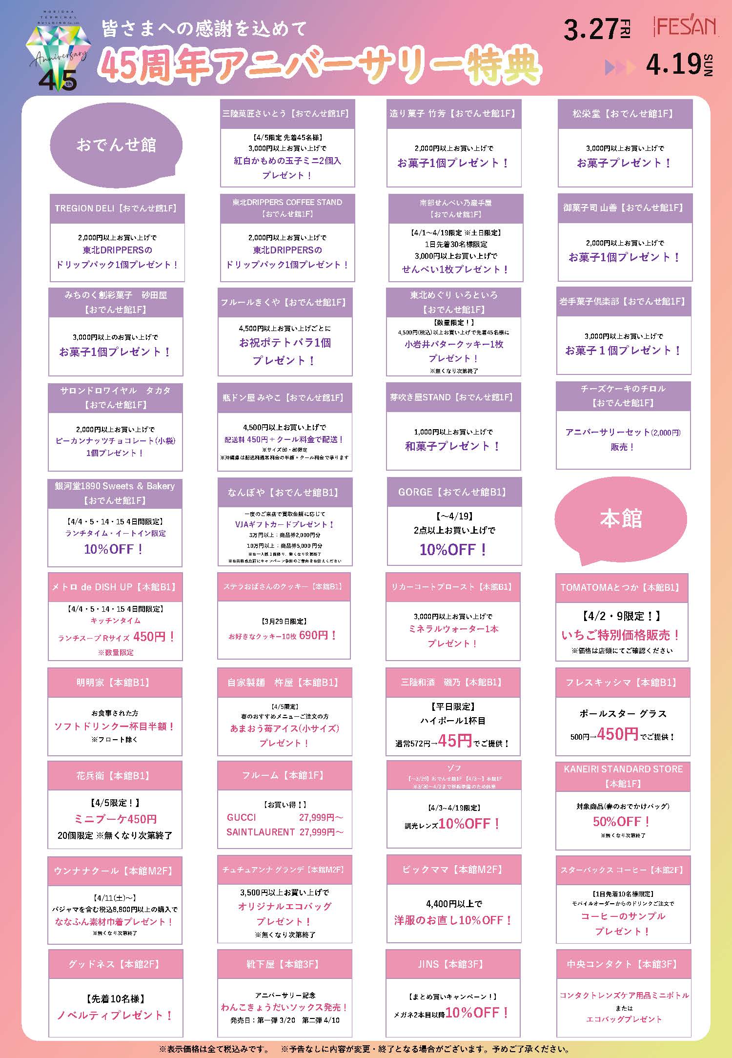 本館・フェザンテラス ●ファッション館(1〜3F) 10:00〜20:00 ●B1 10:00〜20:30 ●B1レストラン 11:00〜21:30