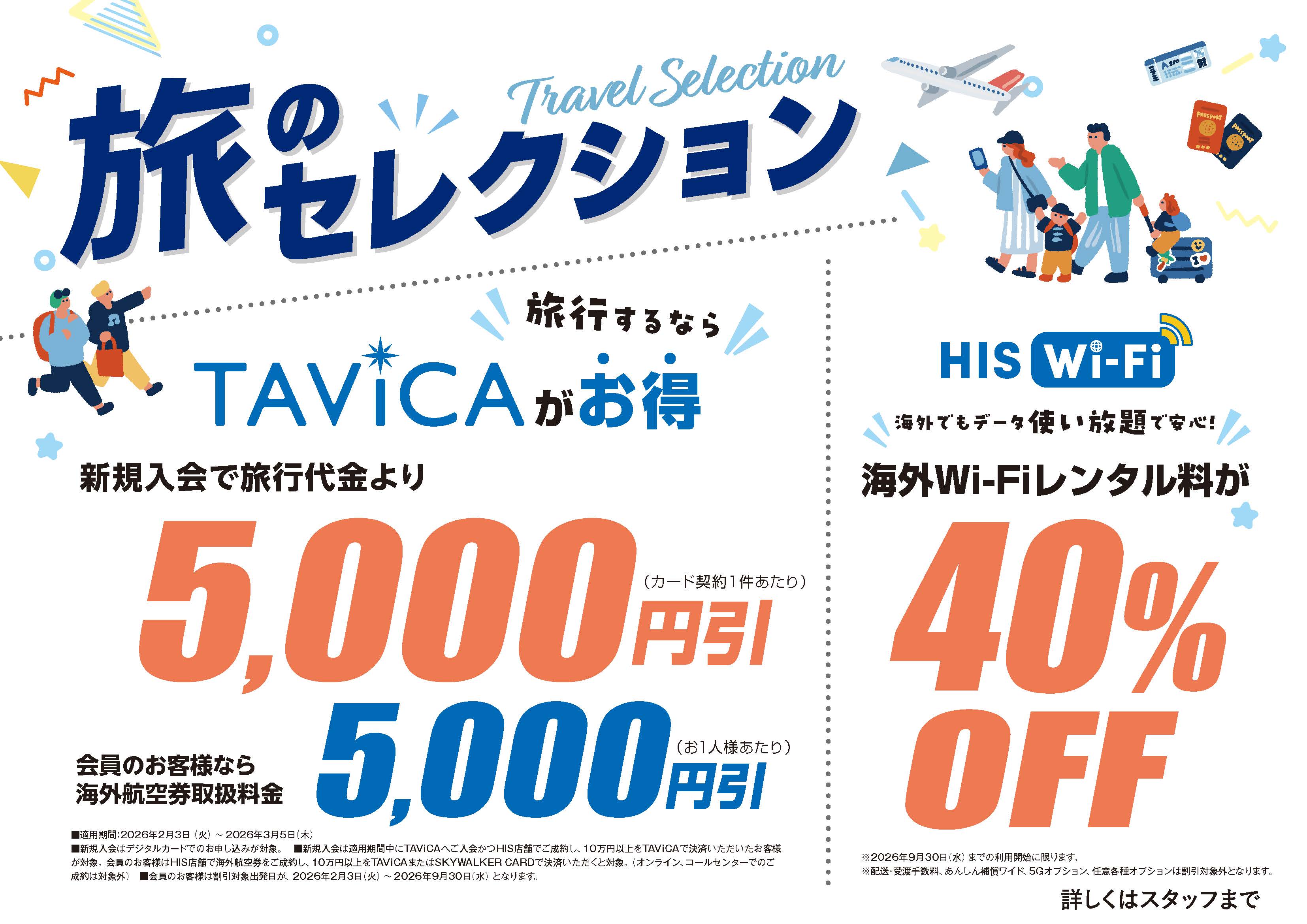 弊社クレジットカードTAVICAを新規でお申込みいただきましたお客様には旅行代金から5,000円の割引をいたします。